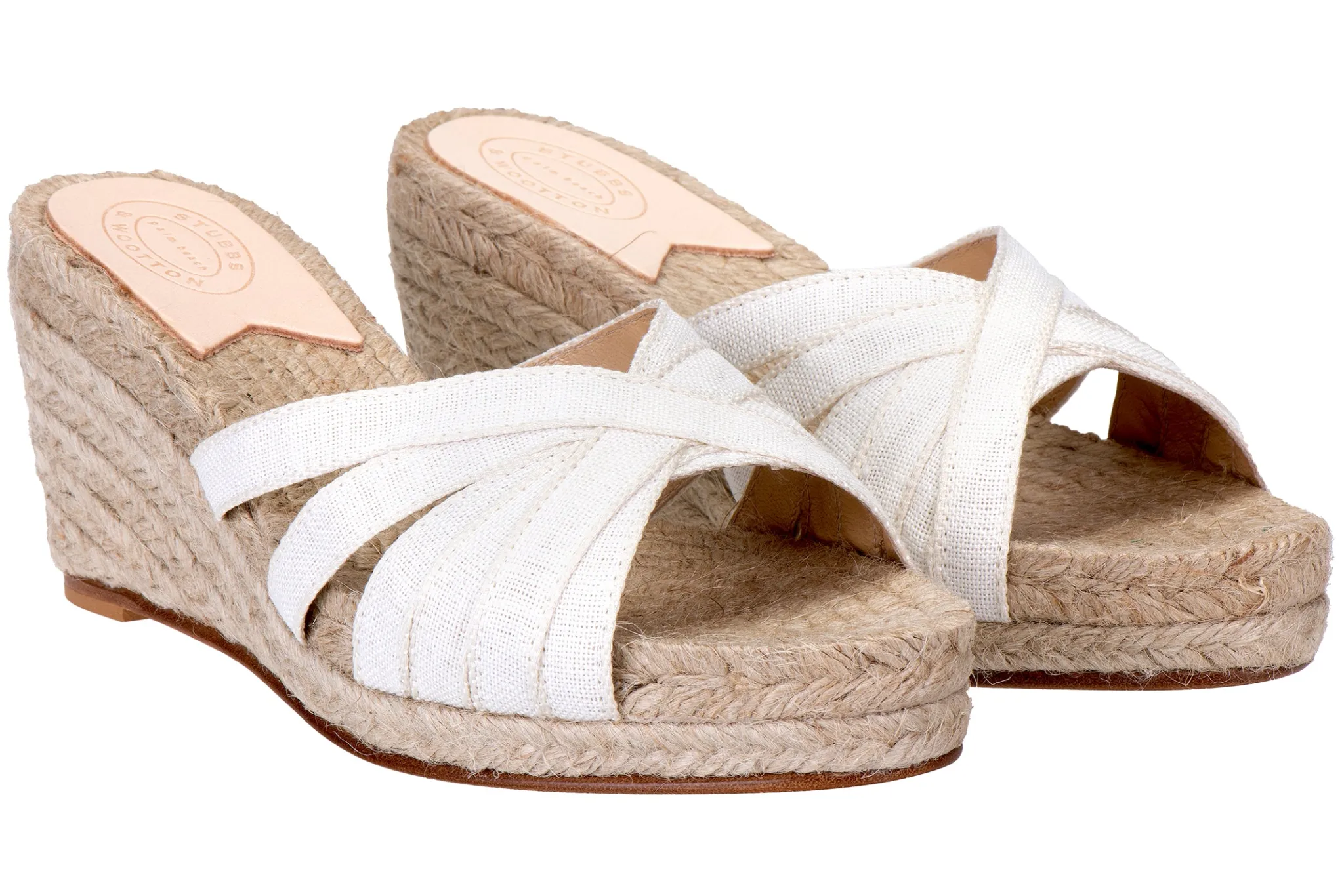 Our Kelly Rib Crema Espadrille features a Crema Grosgrain Ribbon and a Jute Sole. Meticulously Hand-crafted in Spain. The heel is 3 inches in height. Leather soled. True to American sizing. If you wear a half size typically, go to the size up.