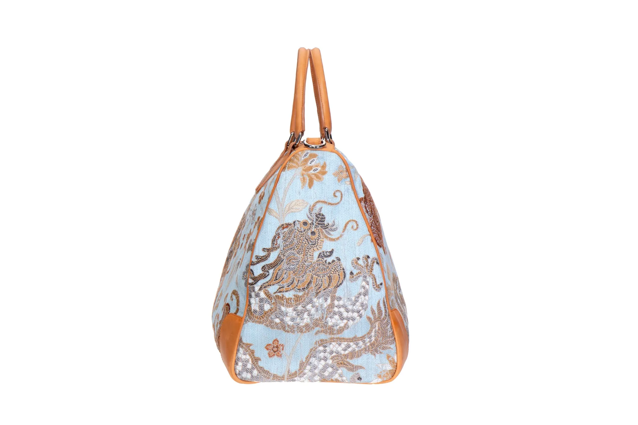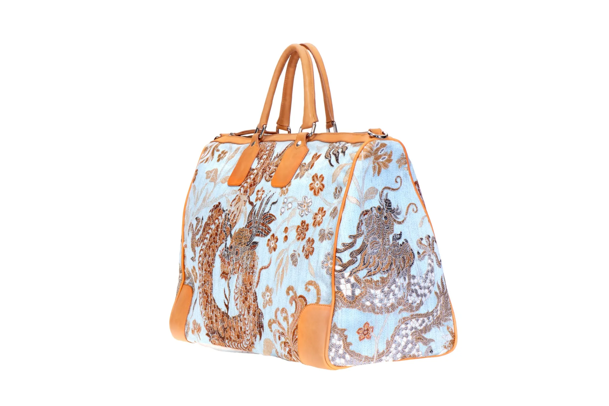 In honor of our long standing partnership with Scalamandré , we would love to introduce the Year of the Dragon collaboration. Utilizing Scalamandré’s brocade jacquard fabric created in partnership with The Met museum, we have created multiple styles to accompany your wardrobe. The inspiration for the brocade was from a woven scroll cover produced to accompany the Qianlong emperor’s calligraphy, the fabric celebrates the visual culture of the Qing dynasty, the last in China’s imperial history. In Chinese culture, the dragon represents good luck, strength, and health. Our Dragon weekender features the silk brocade with leather detailing. Dimensions: 21″ x 15″ x 8″