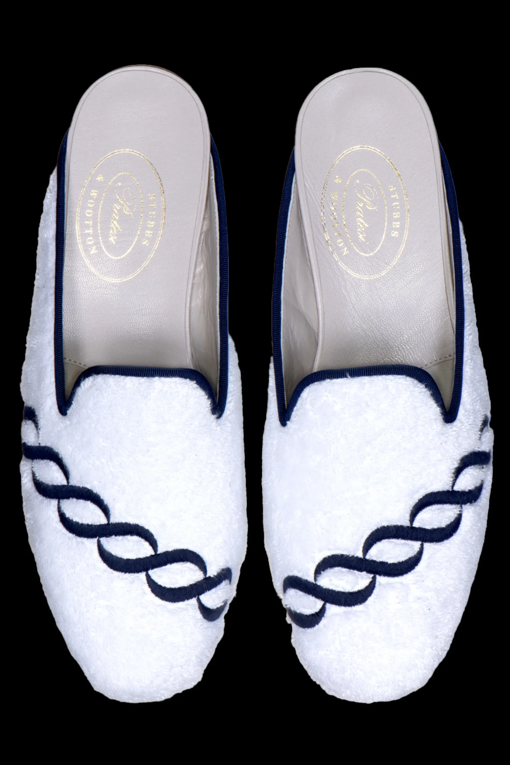 Indulge in our exclusive partnership of rich jewel-toned velvets and exquisite terry cloth, a fusion of comfort and elegance crafted by Stubbs u0026amp; Wootton and renowned Italian linen artisan Pratesi. The Treccia is inspired by the spiraling columns of Florentine architecture, Treccia’s classic braid motif speaks to an everlasting European splendor. Interpreted embroidery showcased in navy colorway on white terry cotton with contrasting navy grosgrain trim. Meticulously Hand-crafted in Spain. Leather lined to provide additional support and comfort. The stacked wooden heel is 3/4″ in height. Leather soled. True to American sizing.