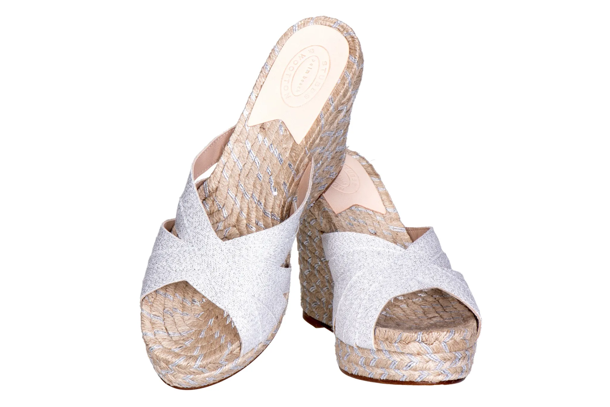 Our Silver Braid Grace Espadrille features a Silver Fleck Ribbon and Jute Sole. Meticulously Hand-crafted in Spain. The heel is 5 inches in height. Leather soled. True to American sizing. If you wear a half size typically, go to the size up.