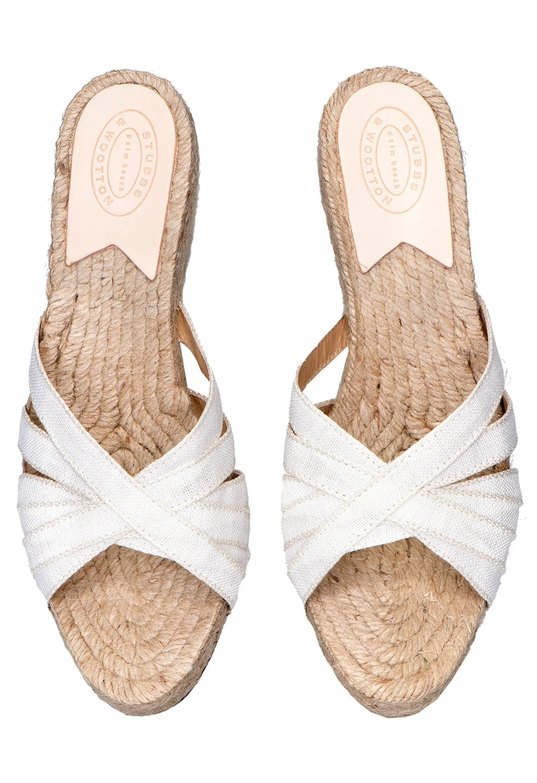 Our Grace Rib Crema Espadrille features a Crema Grosgrain Ribbon and a Jute Sole. Meticulously Hand-crafted in Spain. The heel is 5 inches in height. Leather soled. True to American sizing. If you wear a half size typically, go to the size up.