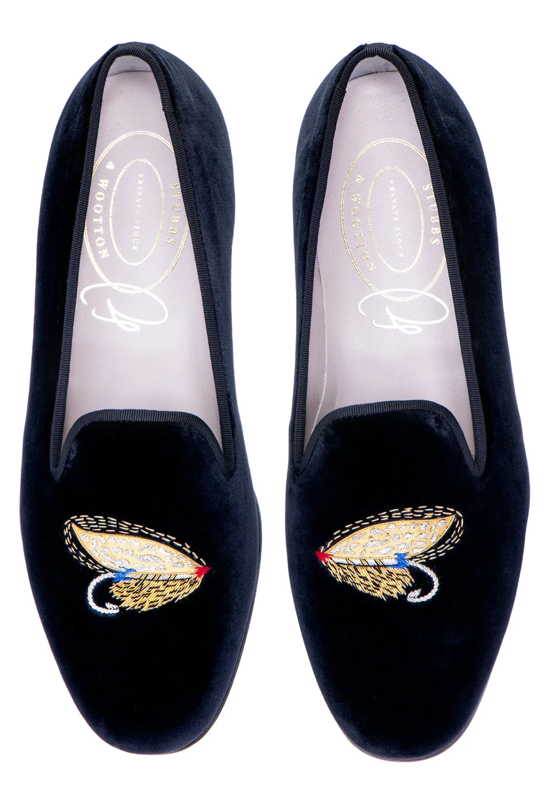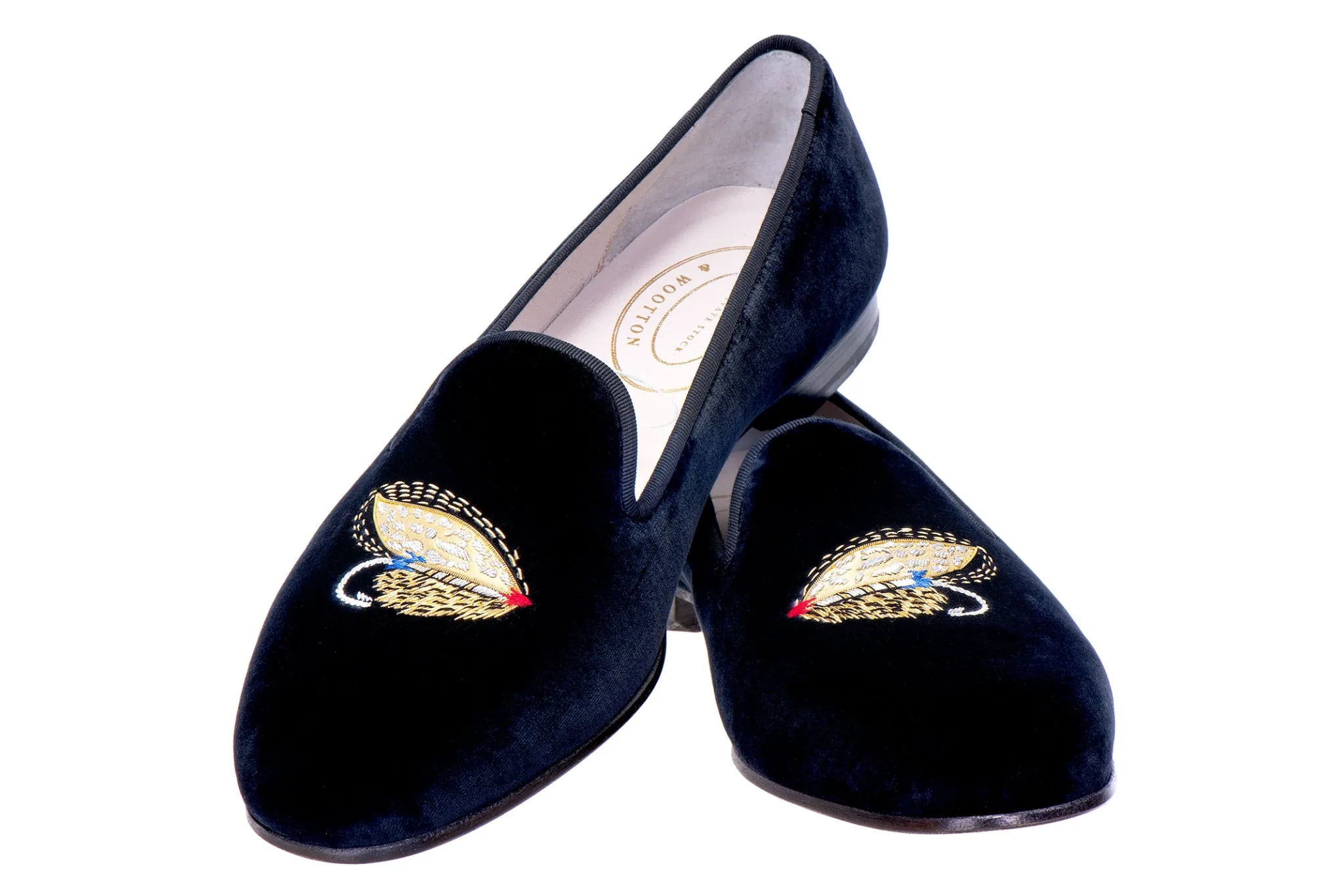 They’re quite the catch 🎣 Available for 1 week only, our exclusive Fly Fishing Trunk Show explores one of our favored sports. We’ve selected an array of archival embroideries, one of a kind, hand-embroidered motifs and created a collection of never seen before styles all in the name of fly-fishing! Our Fly PS slipper features the finest Midnight Blue Sea Island Cotton-Velvet Upper with a matching Grosgrain Trim. Featuring our Fly motif, Hand-Embroidered in London using gold wire. Meticulously Hand-crafted in Spain. Leather lined to provide additional support and comfort. The stacked wooden heel is .75 inches in height Leather soled. True to American sizing.