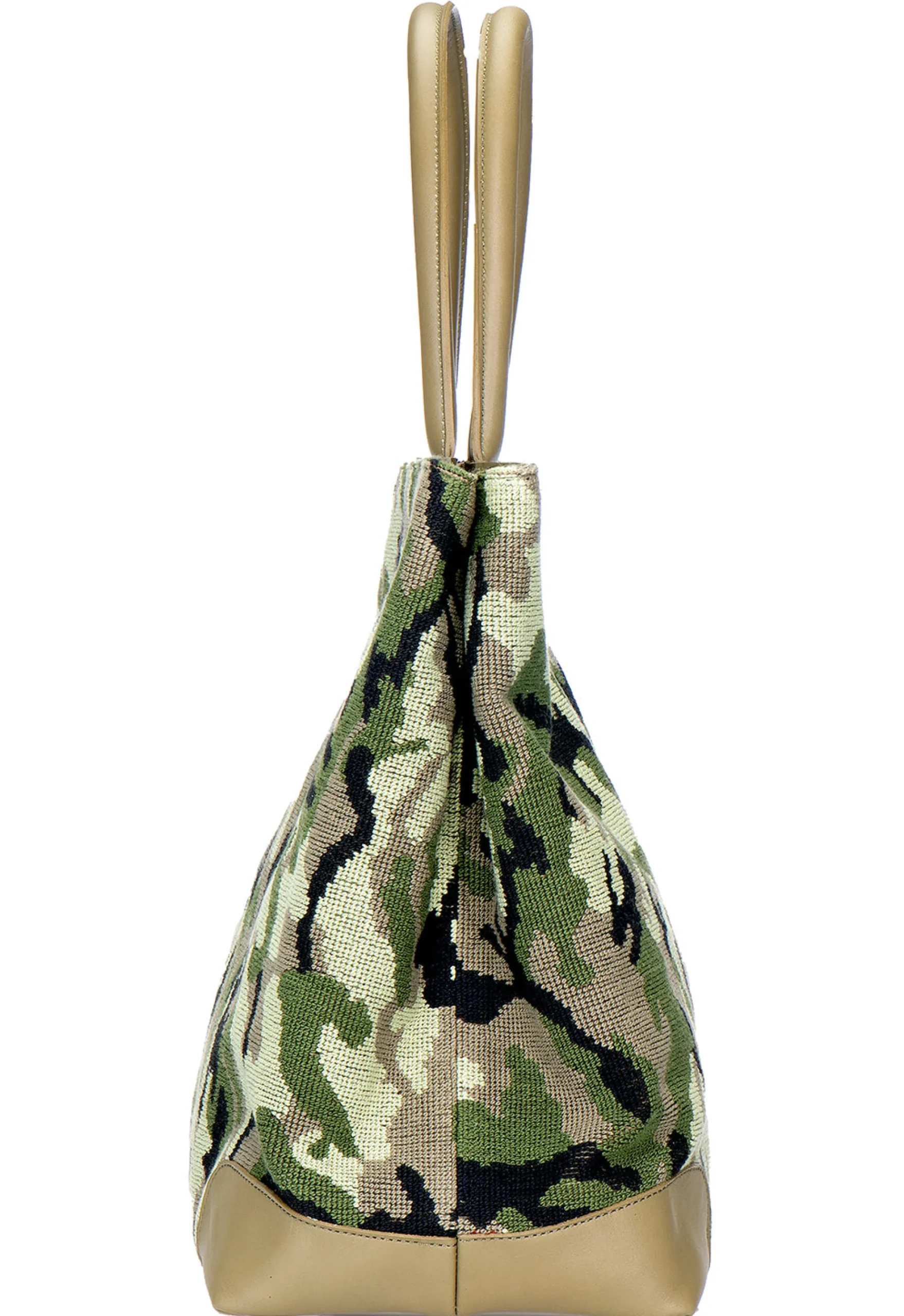 Our Camo Tote features a Patterned Needlepoint with Olive Green Nappa leather detailing. Perfect for day trips and overnight stays! Dimensions – 17″ X 13″ X 8″