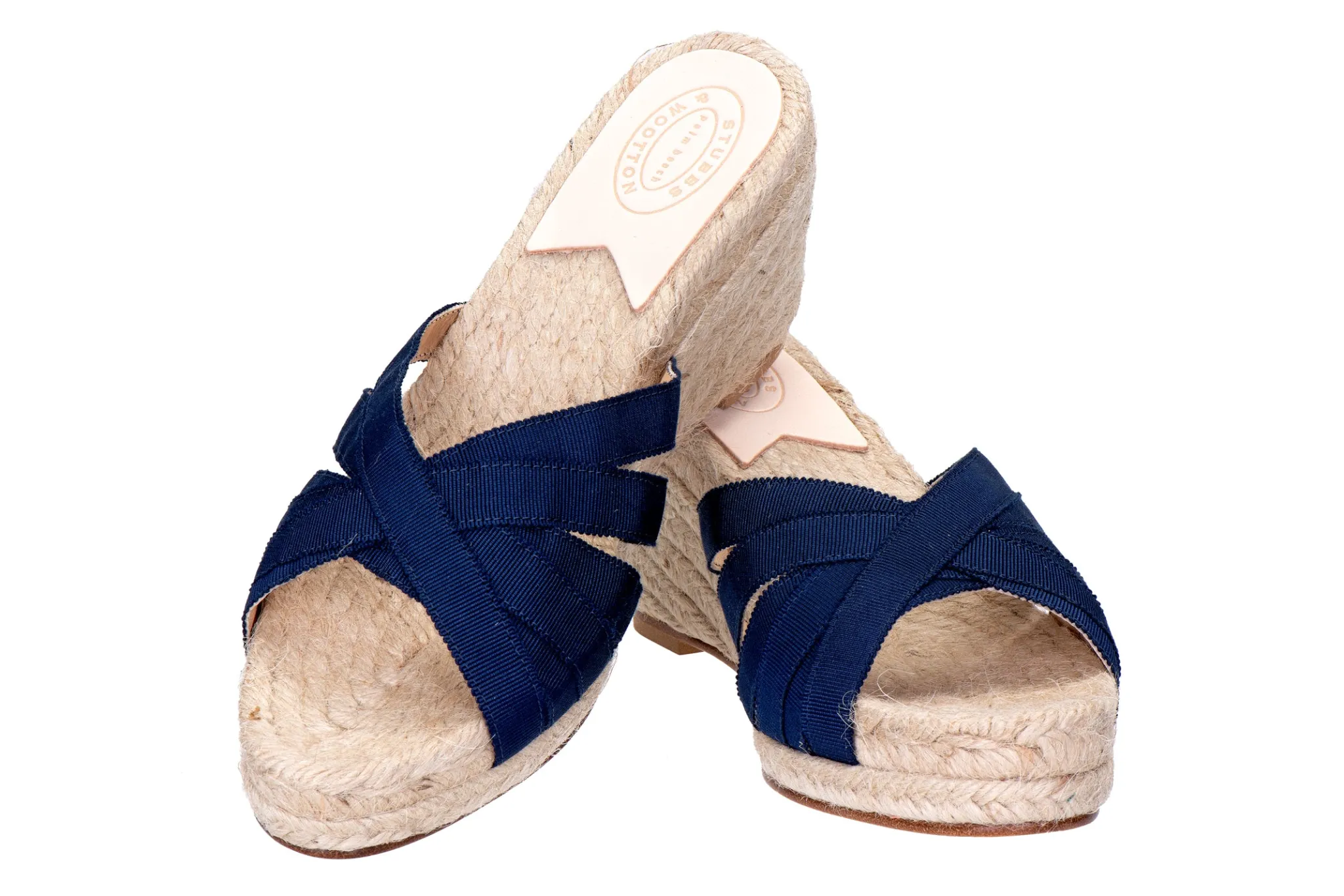 Our Kelly Rib Navy Espadrille features a Navy Grosgrain Ribbon and Jute Sole. Meticulously Hand-crafted in Spain. The heel is 3 inches in height. Leather soled. True to American sizing. If you wear a half size typically, go to the size up.