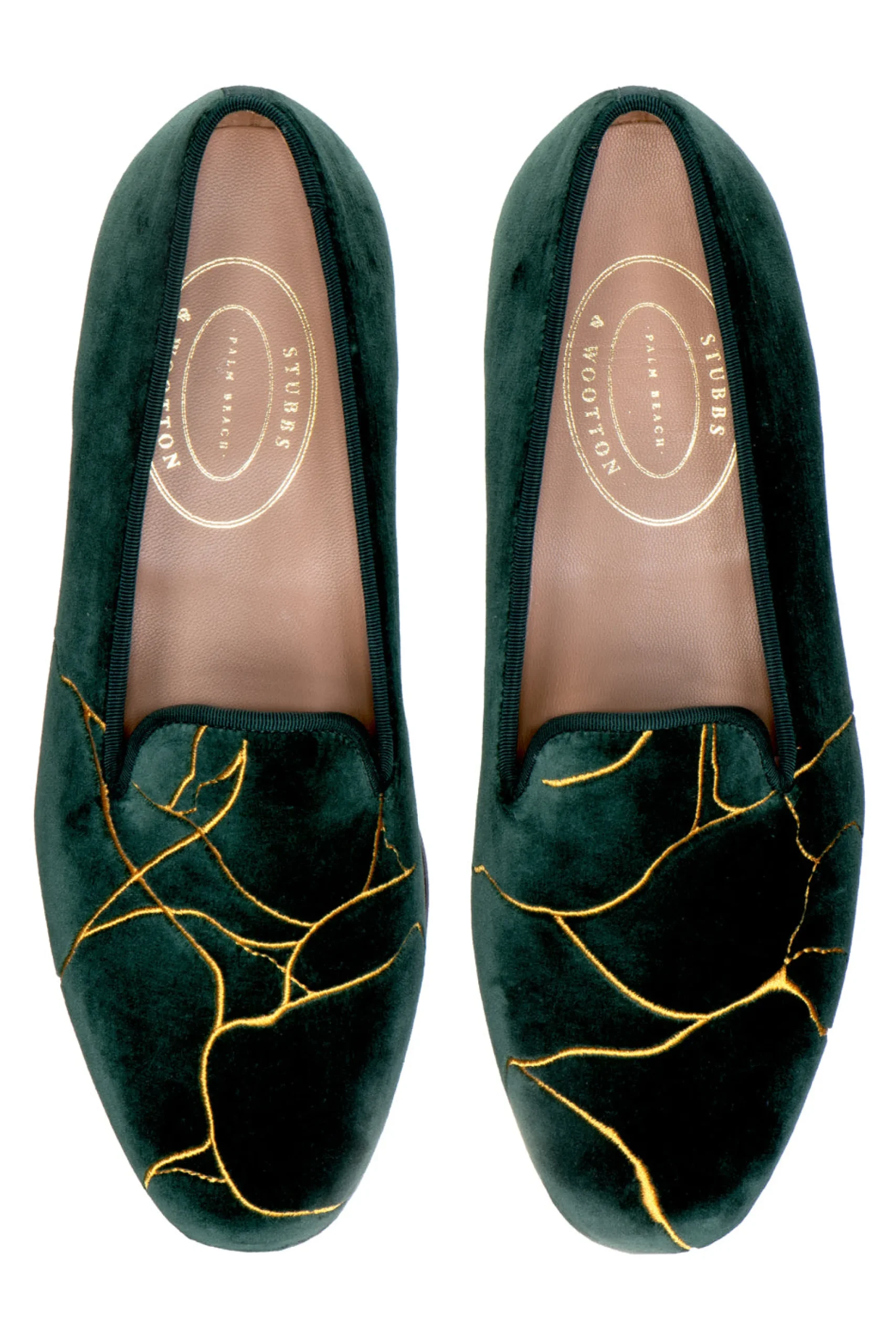 Kintsugi, is the Japanese art of repairing broken pottery by mending the breakage with powdered gold. Our Kintsugi Hunter slipper features a rich cotton velvet fabric with a tonal hunter grosgrain adorned with our gold filament embroidery. Meticulously Hand-crafted in Spain. Leather lined to provide additional support and comfort. The stacked wooden heel is 3/4″ in height. Leather soled. True to American sizing.