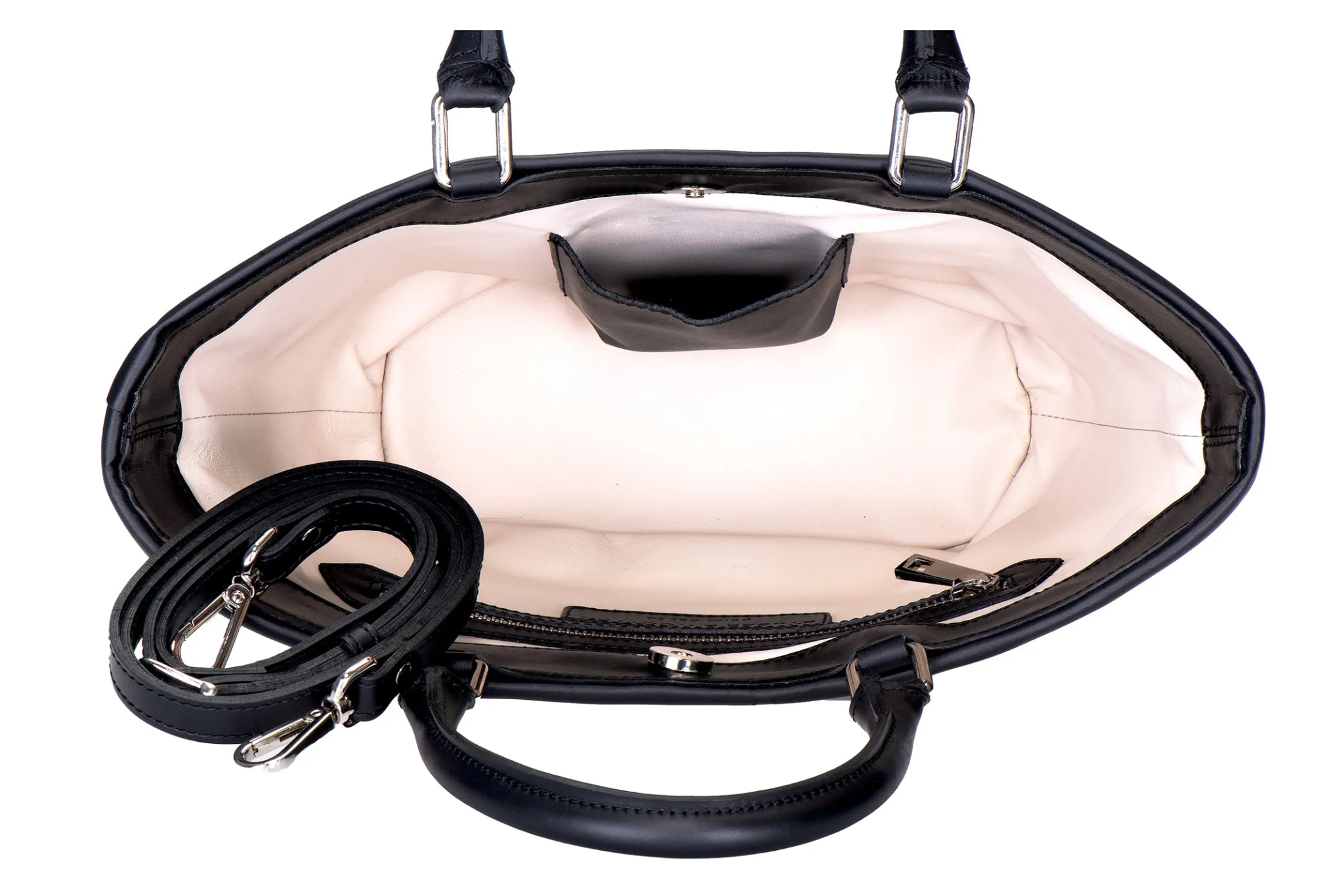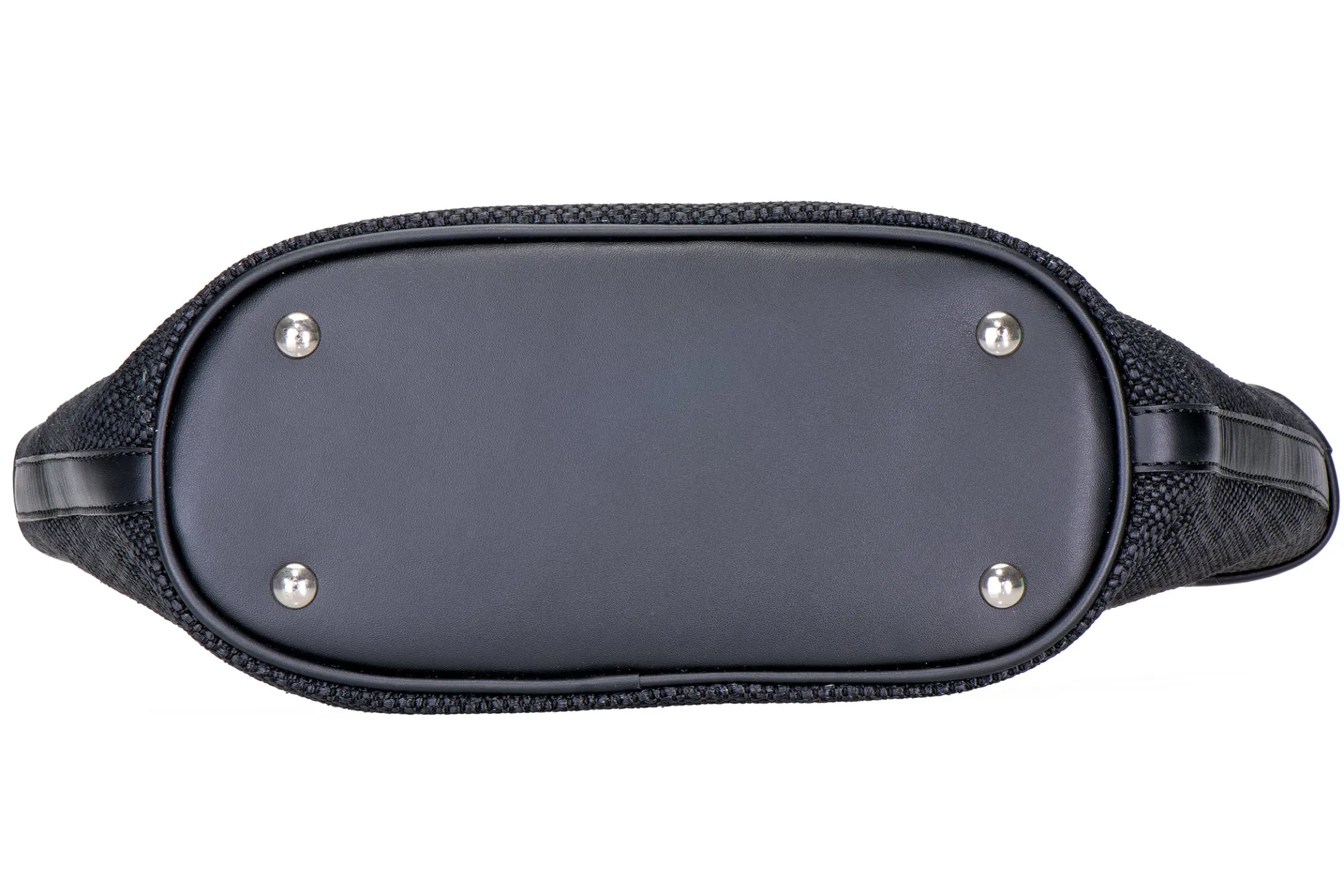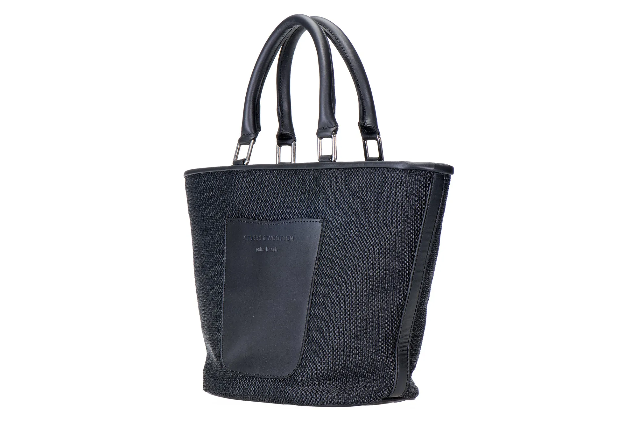 In luxuriously soft Black Leather and durable woven Raffia, this understated mini tote is more than meets the eye. The exquisite straps and custom hardware are specially engineered to fit together seamlessly. A center zip pocket keeps your wallet secure and an outside pocket that is smartphone perfect. Dimensions – 14″(length) X 9″(height) X 5″(depth)